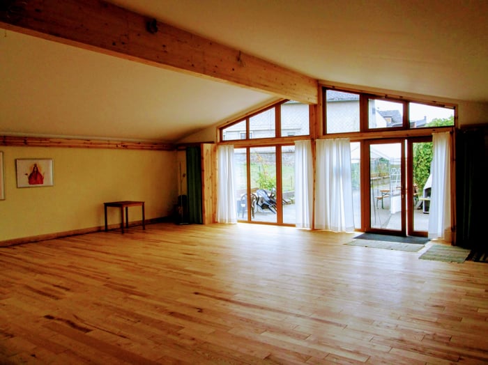Der Seminarraum/Yogaraum in der Oase Greifenstein ist weit, hell und gemütlich.
